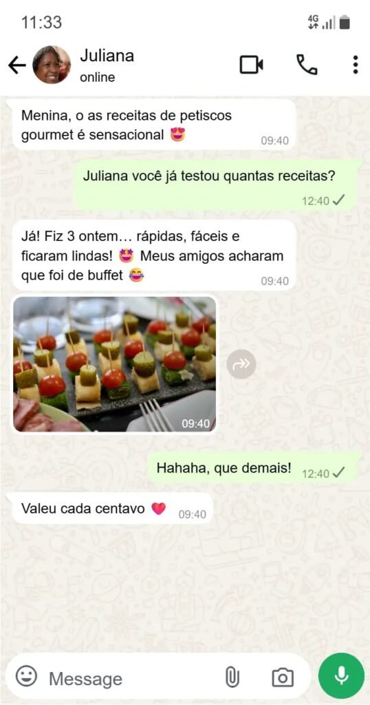 “Não é apenas uma coleção de receitas. É o seu passaporte para dominar a arte dos petiscos gourmet, impressionar todos ao seu redor e — se desejar — transformar essa habilidade em um negócio lucrativo.”